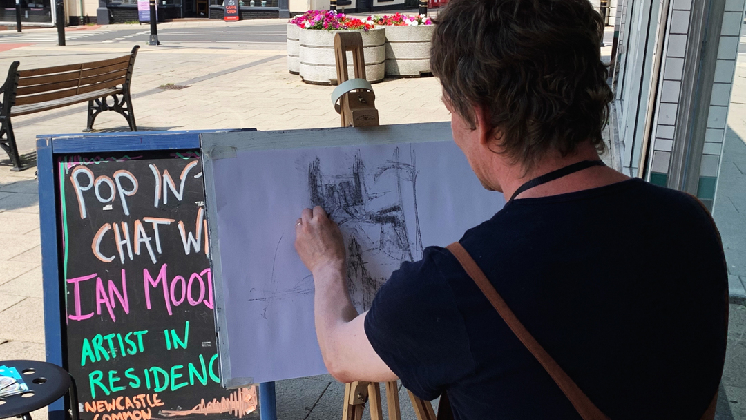 Current artist in residence Ian Mood, has been based within the 23 High Street space where he’s been holding ‘meet the artist sessions’ but a lot of his time has been spent out and about in the heart of the town. Now a familiar face and presence with the traders at the various market days on the stones, Ian has been capturing the everyday life and faces that make Newcastle such a special place to live.